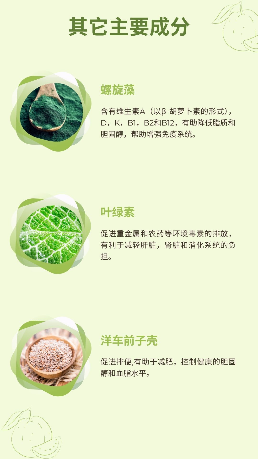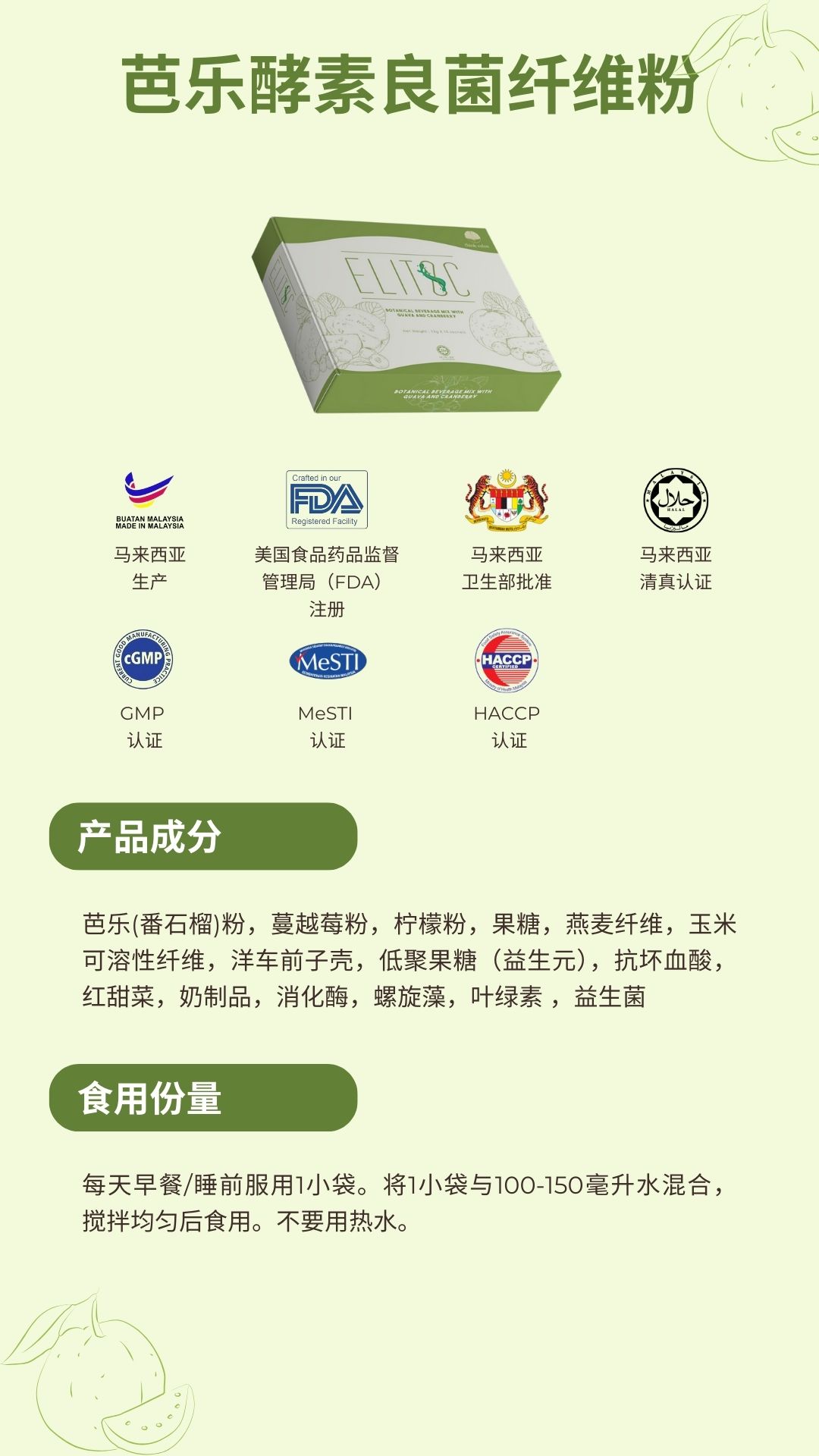 成分: 芭乐(番石榴)粉,蔓越莓粉,檸檬粉,果糖,燕麥纖維,玉米可溶性纖維,洋車前子殼,低聚果糖(益生元),抗壞血酸,紅甜菜,奶製品,消化酶,螺旋藻,葉綠素 ,益生菌