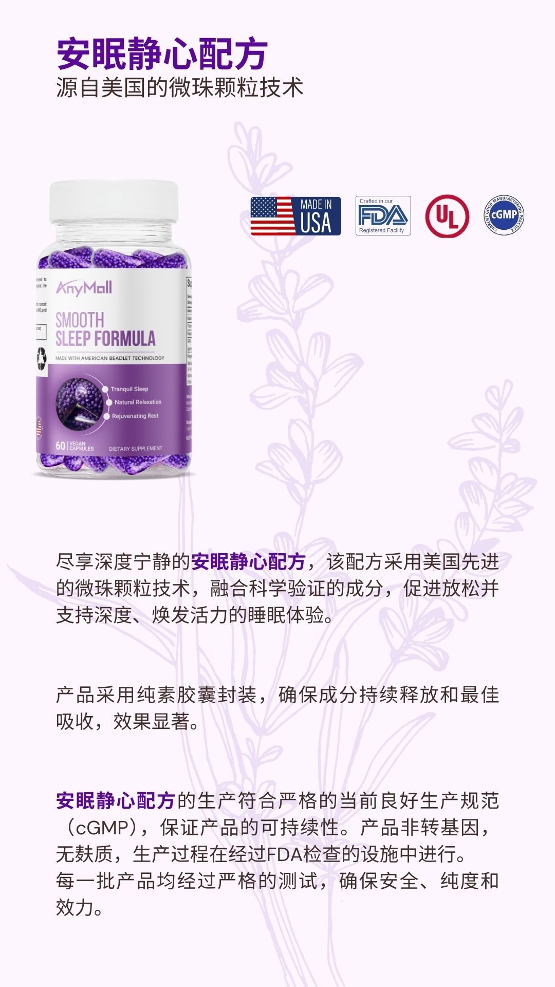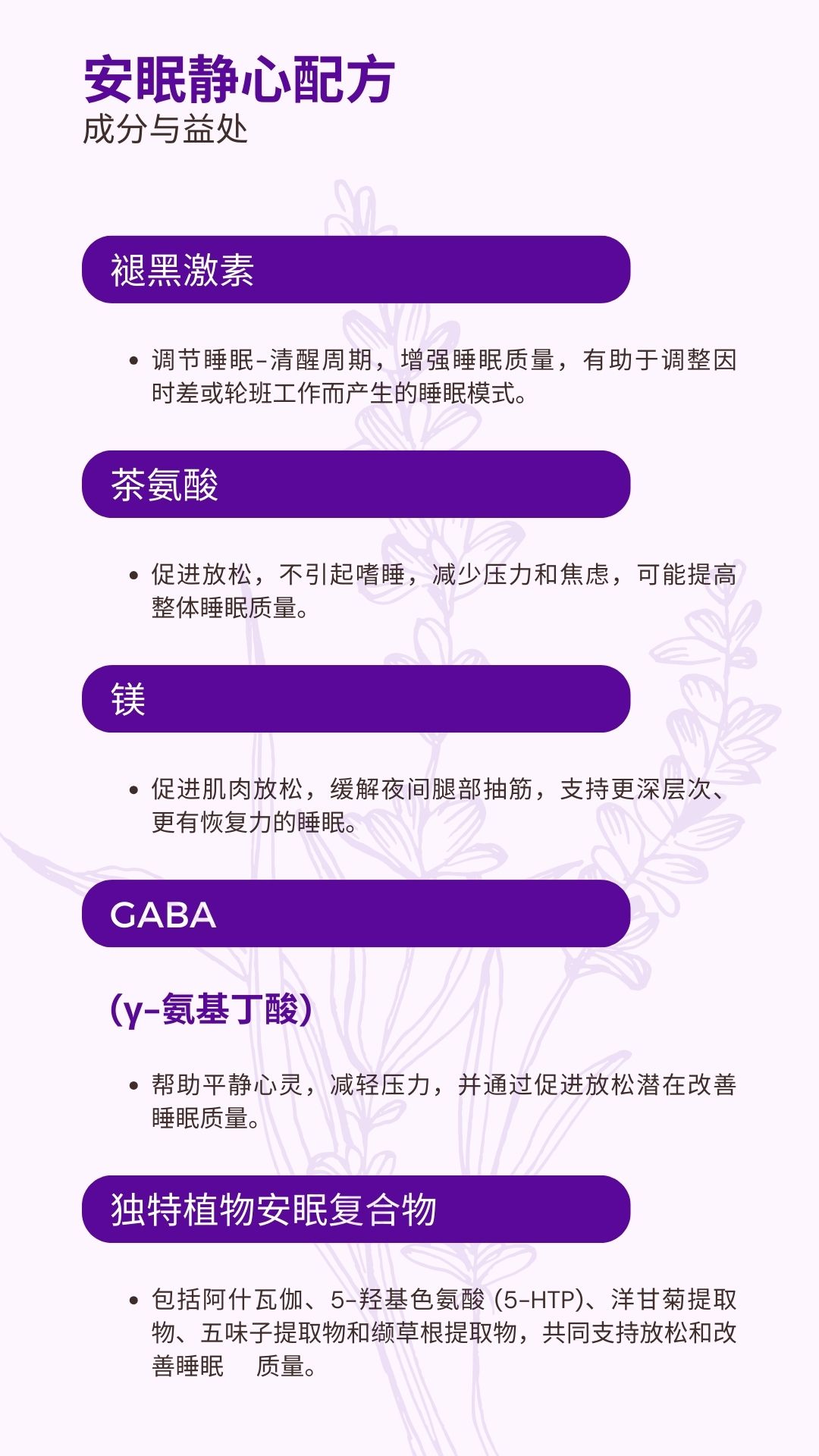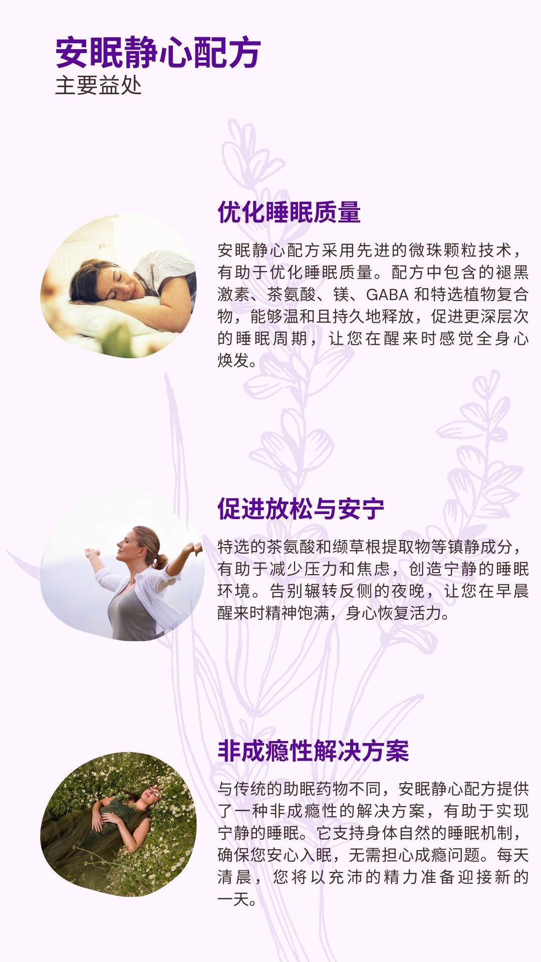 尽享深度宁静的安眠静心配方,该配方采用美国先进的微珠颗粒技术,融合科学验证的成分,促进放松并支持深度、焕发活力的睡眠体验。